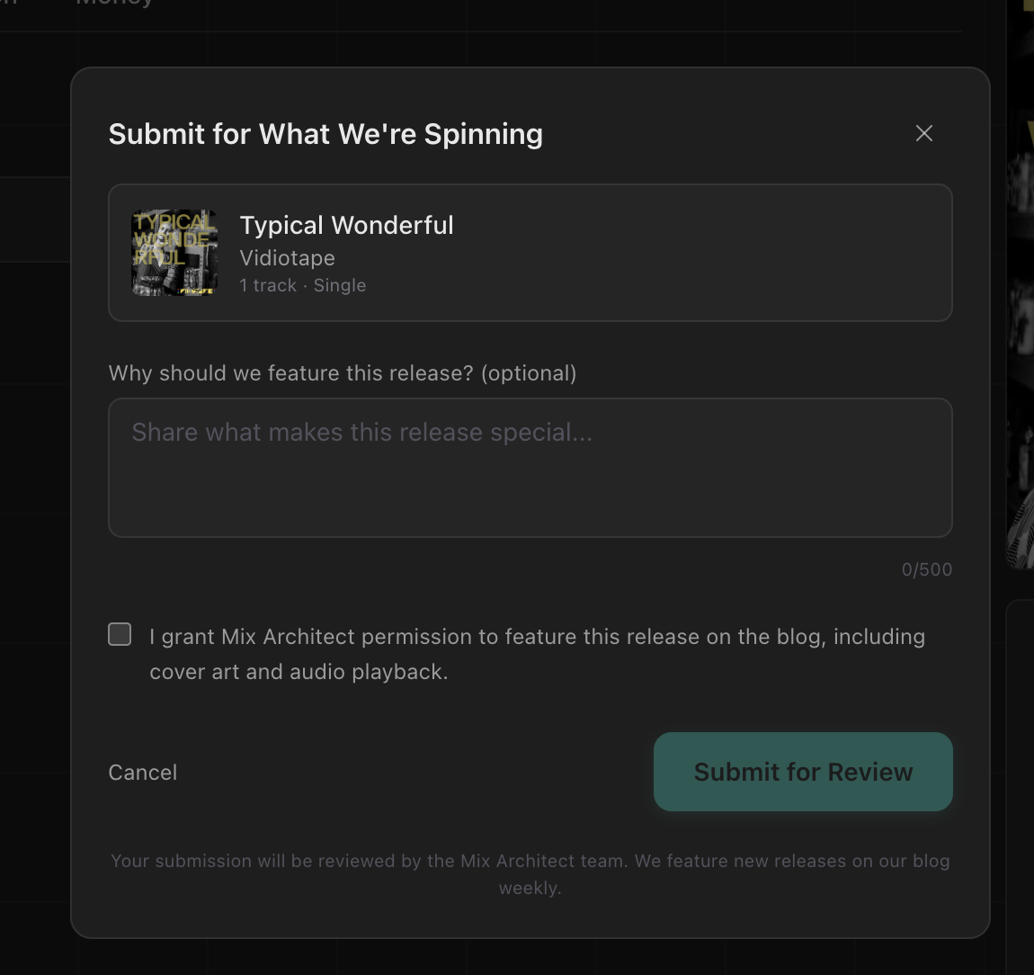 If you've finished a release you're proud of, you can submit it for consideration directly from your release page. Hit "Submit for Feature" on any completed release. It pulls your metadata automatically, so there's no form to fill out beyond an optional pitch note. If your release gets picked, it goes live with full production credits and streaming links, and you'll see a "Featured on Blog" badge on your release page.